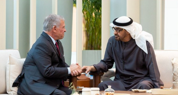 بحث صاحب السمو الشيخ محمد بن زايد آل نهيان رئيس الدولة "حفظه الله"، وصاحب الجلالة الملك عبدالله الثاني بن الحسين عاهل المملكة الأردنية الهاشمية الشقيقة، اليوم، العلاقات الأخوية الراسخة بين البلدين وسبل تعزيز تعاونهما وتطويره بما يحقق مصالحهما المشتركة ويلبي تطلعات شعبيهما نحو التنمية والازدهار، إضافة إلى مجمل القضايا والأوضاع الإقليمية والدولية ذات الاهتمام المشترك.