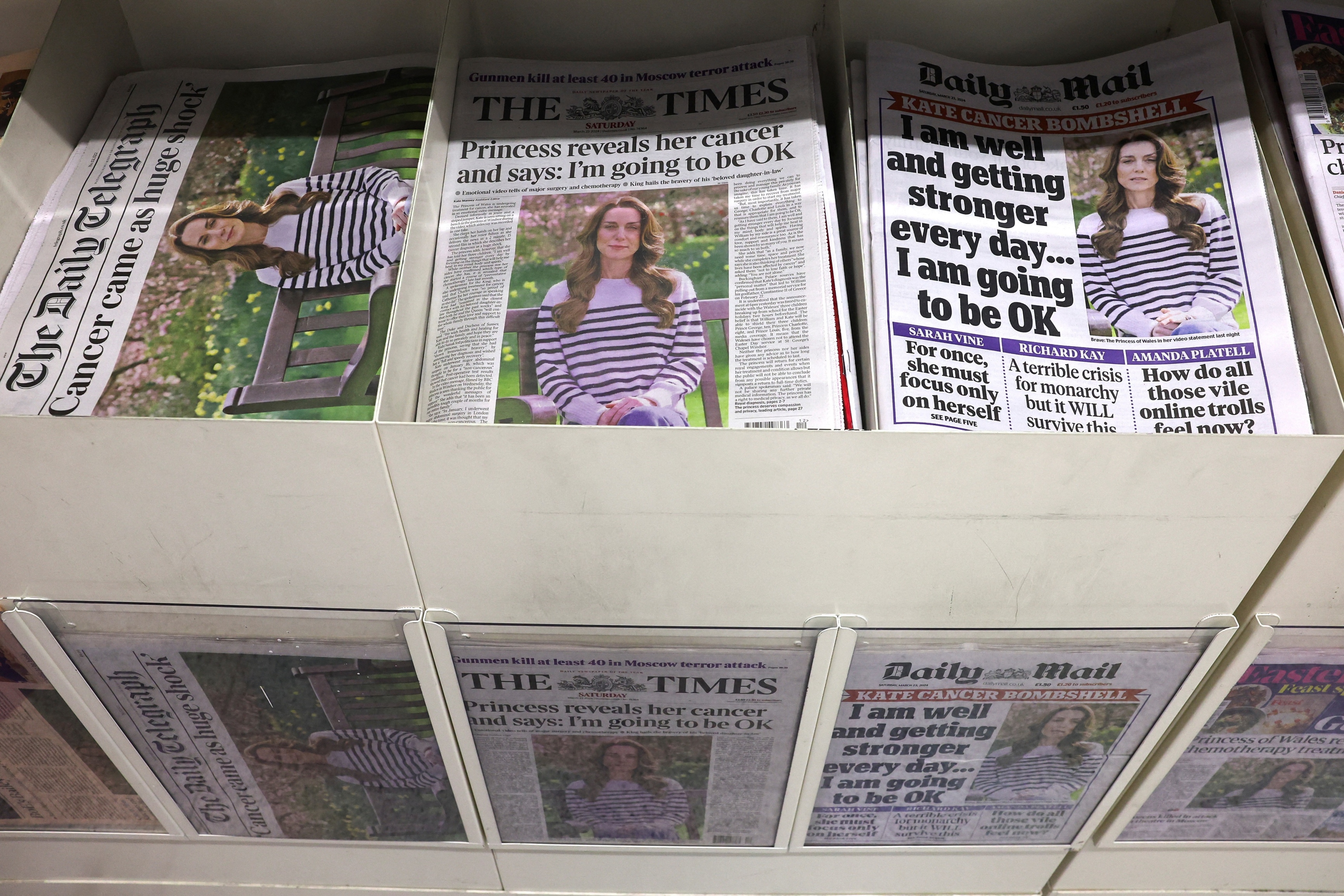 هيمن الخبر الصادم الذي أعلنته كايت ميدلتون أميرة ويلز البريطانية أمس الجمعة عن تشخيص إصابتها بالسرطان على الصفحات الأولى للصحف البريطانية الصادرة اليوم السبت مصحوبا برسائل دعم مقرونة بانتقادات لأولئك الذين تكهنوا بشأن صحتها.