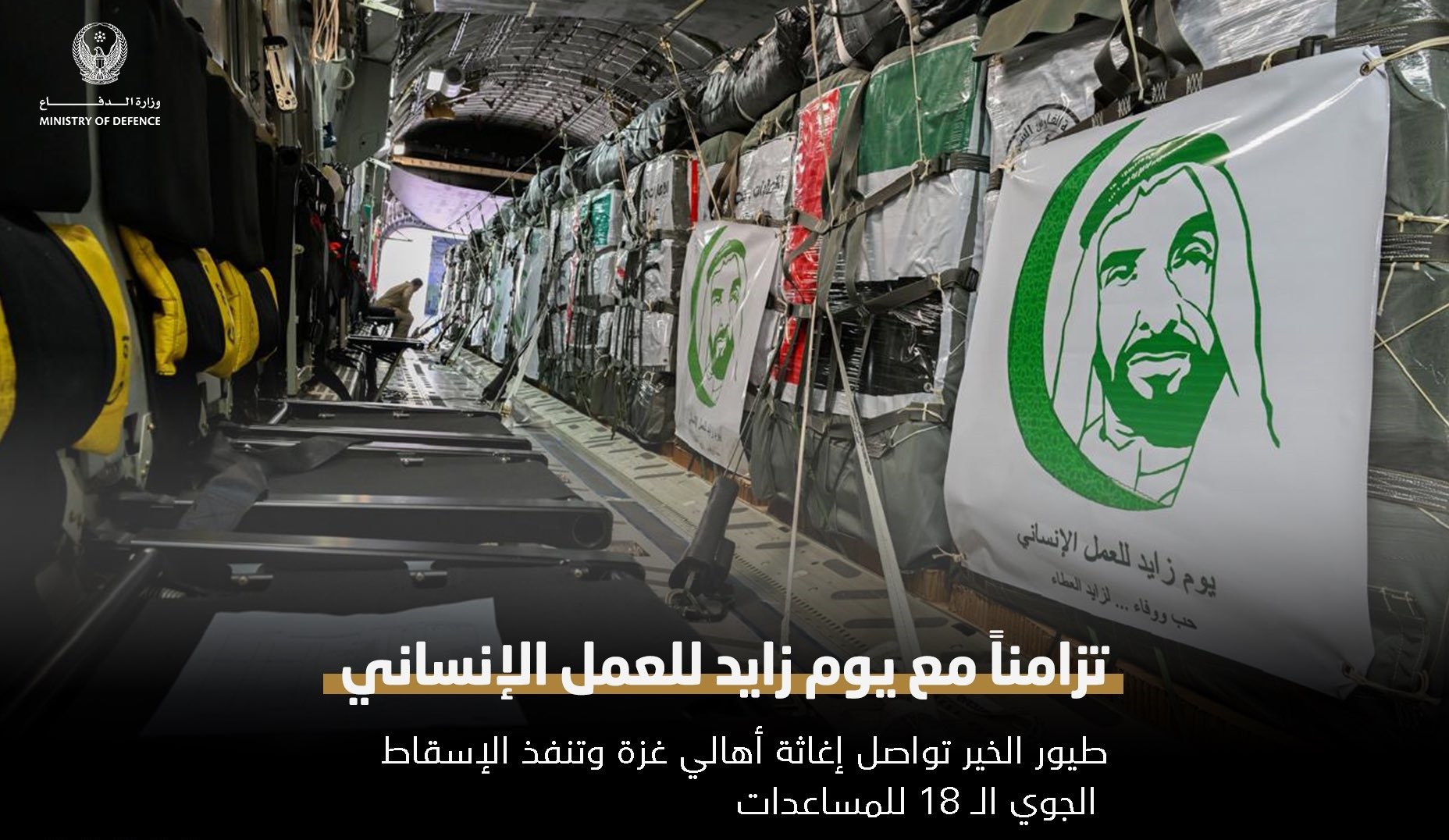 تزامناً مع يوم زايد للعمل الانساني، أعلنت قيادة العمليات المشتركة في وزارة الدفاع عن تنفيذ عملية "طيور الخير" الإسقاط الجوي الـ 18 للمساعدات الإنسانية والإغاثية على شمال قطاع غزة.