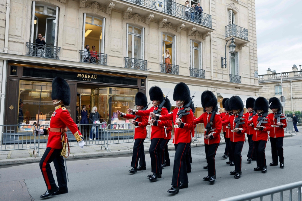 وقف 32 عنصرا من الحرس الجمهوري التابع لقوات الدرك الفرنسية و40 عنصرا من "الحرس الاسكتلندي" أمام قصر باكينغهام.