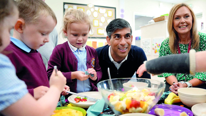 سوناك يتحدث لأطفال إحدى المدارس. أ.ف.ب