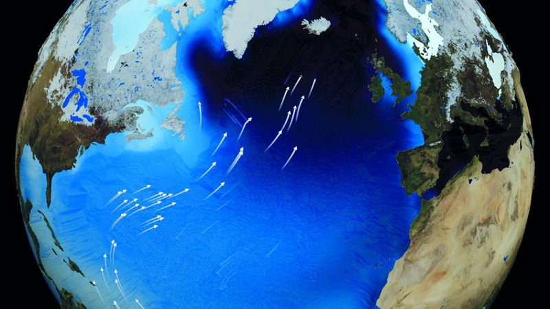 وبعد ذلك، عندما تمر المياه السطحية شمال آيسلندا، فإنها تفقد ما يكفي من الحرارة لزيادة كثافتها، ما يؤدي إلى انخفاضها وتكوين مياه عميقة دافئة. وتشكل بداية هذه العملية الحزام الناقل العالمي للمياه العميقة، الذي يربط جميع محيطات العالم، وينقل الحرارة ببطء حول الكوكب على أعماق تزيد على ميل واحد تحت السطح.