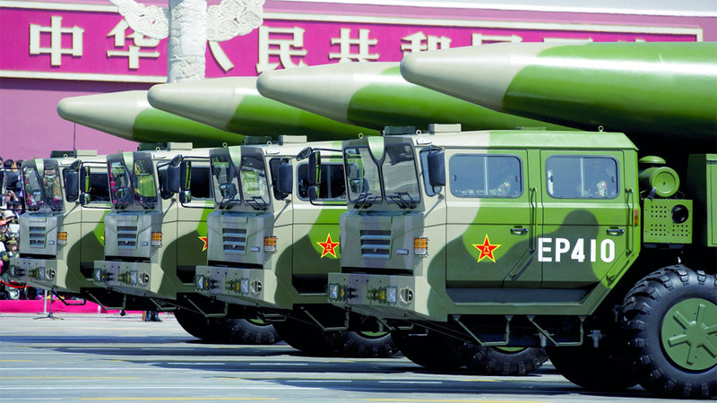 مركبات عسكرية صينية تحمل صواريخ باليستية من طراز دي إف-26 خلال استعراض عسكري. رويترز