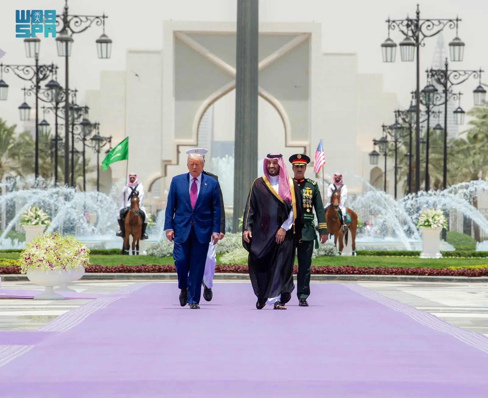 وثق مقطع فيديو لقناة الإخبارية السعودية لحظة وصول موكب الرئيس الأميركي دونالد ترامب اليوم إلى قصر اليمامة في الرياض حيث رافقت موكبه الخيول العربية ، فيما لفتت ربطة عنق الرئيس الأميركي الأنظار بلونها البنفسجي تناغما مع لون السجادة الأرجوانية المعدة لاستقبال كبار الضيوف..