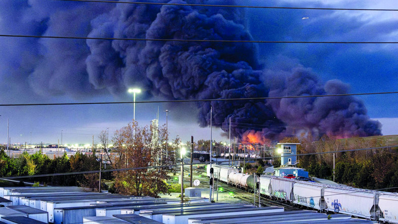 الدخان يتصاعد من موقع تحطم الطائرة بعد إقلاعها من مطار مدينة لويفيل. رويترز