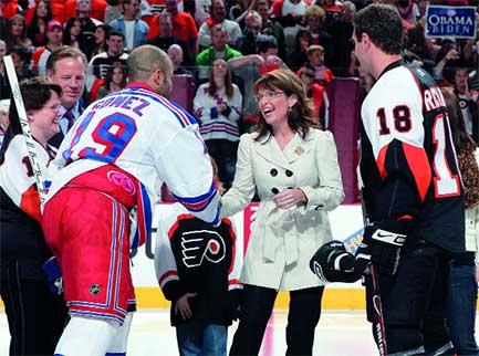 وبعد ضجة أحدثتها مطالبة نواب في الكونغرس المحلي لولاية آلاسكا بمحاكمة بالين بتهم سوء استخدام السلطة، عادت المرشحة الجمهورية لتفجر جدلاً جديداً من خلال ظهورها في ملعب لرياضة الـ«هوكي» التي تمارس على الجليد في فيلادلفيا. وقامت بالين، برفقة ابنتيها ويلو وبابر، بمصافحة اللاعبين وأمضت دقائق في الحديث مع أبطال اللعبة.