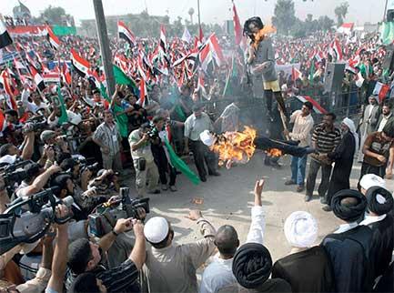ورفع المشاركون أعلاماً عراقية كما حملوا دمى تمثل وزيرة الخارجية الاميركية كوندوليزا رايس مرتدية حجاباً اسود اللون والرئيس جورج بوش واضعاً ضمادات طبية في يديه ورأسه.