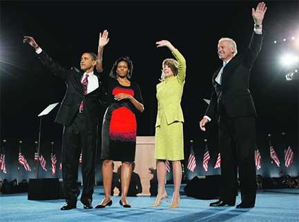 أوباما وزوجته ميشيل مع نائب الرئيس جوزيف بايدن وزوجته يحيّون أنصارهم. غيتي