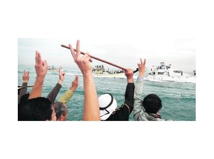 أهالي غزة يرحبون بسفينة «الكرامة» لدى وصولها إلى ميناء المدينة. رويترز