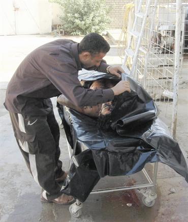 عراقي يبكي أمام جثة أخيه الذي قتل بانفجار في بعقوبة. أي بي إيه