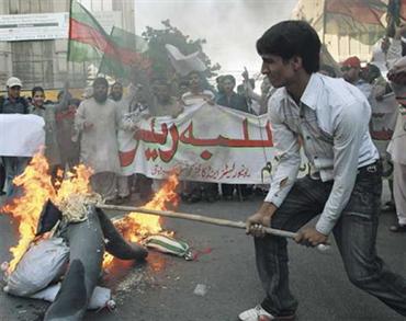 متظاهرون باكستانيون غاضبون يحرقون دمية تمثل الرئيس الأميركي. أ.ب