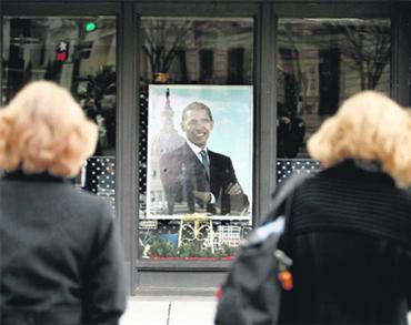 صورة لأوباما على واجهة مركز يبيع مستلزمات حفل تنصيب الرئيس. أ ف ب