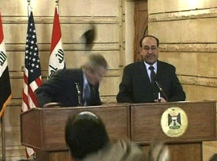قام صحفي عراقي برشق حذائه باتجاه الرئيس الاميركي جورج بوش ورئيس الوزراء نوري المالكي دون أن يصيبهما بينما كانا في مقر الأخير مساء أمس، ثم شتم الرئيس الاميركي، بحسب مراسل فرانس برس.
