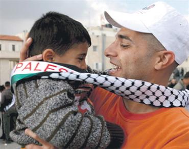 أسير مفرج عنه يحتضن طفله في رام الله أمس. إي. بي. إيه