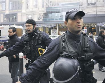 عناصر من الشرطة الفرنسية يضربون طوقاً أمنياً حول متجر برينتان. رويترز