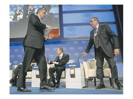 وكان الرئيس الاسرائيلي شيمون بيريز سأل اردوغان بصوت عال وملوحاً بيده بعصبية باتجاهه: ماذا ستكون ردة فعله لو ان الصواريخ تسقط كل ليلة على اسطنبول. وحاول اردوغان الرد على بيريز لكن الصحافي الذي كان يدير حلقة النقاش قاطعه مرات عدة، فما كان منه الا ان انسحب من منتدى دافوس غاضباً. وكان يشارك في النقاش الامين العام للامم المتحدة بان كي مون، والامين العام لجامعة الدول العربية عمرو موسى.