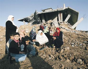 أسرة فلسطينية تفترش ركام بيتها الذي دمره العدوان على غزة. غيتي