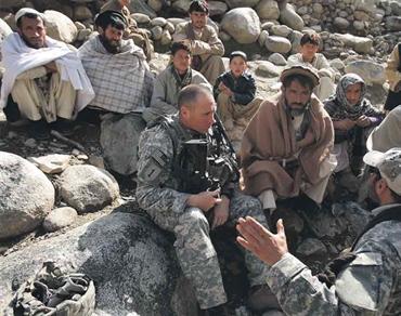 قرويون أفغان يستمعون لشرح من جنديين أميركيين حول الوضع الأمني. غيتي