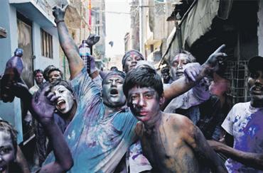 احتفالات بعيد الهول في بنغلاديش حيث يرمي الناس بعضهم بعضاً بالمياه الملونة. إي.بي.أيه