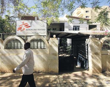 سوداني يمر أمام مقر منظمة «أطباء بلا حدود» في الخرطوم التي اختطف 3 من موظفيها. رويترز