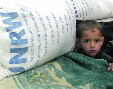 طفل فلسطيني يطل من بين أكياس المساعدات في مخيم رفح. أ.ف.ب