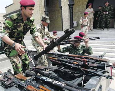 جنود عراقيون يجمعون الأسلحة المصادرة من قوات الصحوة في بغداد أمس. أ.ف.ب