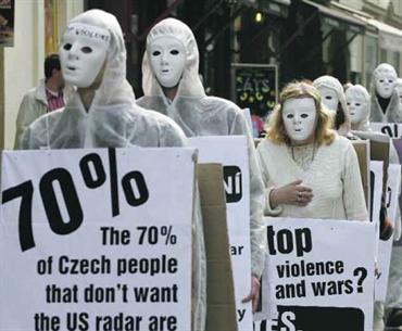 ويشهد وسط براغ بعد الظهر تظاهرة مناهضة للمشروع الاميركي، واصطف متظاهرون شبان ملثمون على الطريق الذي ستسلكه التظاهرة، رافعين لافتات كتب عليها «نعم، يمكننا ان نقول لا للرادار المضاد للصواريخ».