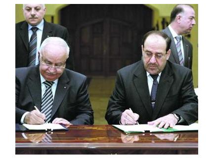 على صعيد آخر، أبرمت بغداد أمس مذكرة تفاهم مشتركة مع دمشق في مجالات النفط والتجارة والطاقة، خلال زيارة رئيس الوزراء السوري محمد ناجي العطري للعراق. وقال المالكي في مؤتمر صحافي مشترك مع العطري إن الحوارات بين الجانبين انتهت إلى اتفاق استراتيجي في مجالات النفط والتجارة والطاقة والغاز. ووصف الطالباني أمس الزيارة بأنها «فاتحة عهد جديد لإقامة علاقات استراتيجية». وقال خلال استقباله العطري «هذه الزيارة فاتحة عهد جديد لإقامة علاقات استراتيجية على كل المستويات السياسية والاقتصادية والأمنية والتجارية والنفطية، والظروف متوافرة لإقامة العلاقات المديدة بين البلدين».