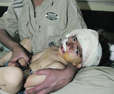 عراقي في أحد مستشفيات الكاظمية يحمل طفلاً أصيب في الانفجار قرب مرقد الإمام موسى الكاظم. رويترز