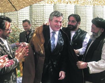 مسؤولون أفغان يُلبسون براون عباءة عند زيارته لشكركاه. رويترز