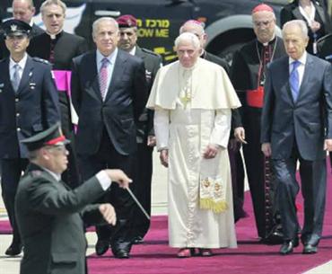 دعا البابا بنديكتوس السادس عشر أمس لدى وصوله إلى مطار بن غوريون (اللد) في أول زيارة إلى «الأراضي المقدسة»، إلى مصالحة بين الإسرائيليين والفلسطينيين، ودان معاداة السامية «المقيتة».