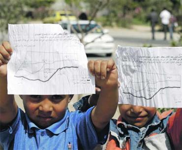 طفلان فلسطينيان يحملان منشورات التحذير الإسرائيلية. أ.ب