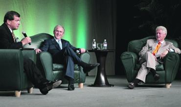 اجتذبت مناظرة بين الرئيسين الأميركيين السابقين، بيل كلينتون وجورج دبليو. بوش، آلاف المشاهدين ومئات المتظاهرين أول من أمس، في تورونتو في كندا.