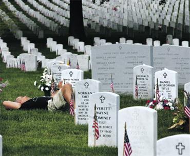 جندي أميركي نائم وسط قبور زملاء له قتلوا في العراق في مدافن ارلنغتون. إي.بي.إيه