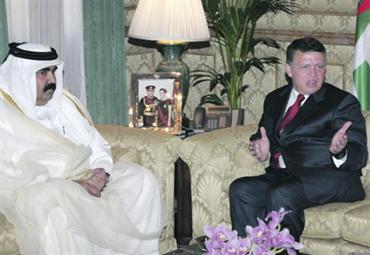 أجرى العاهل الاردني الملك عبدالله الثاني مع امير قطر الشيخ حمد بن خليفة آل ثاني امس مباحثات حول عملية السلام في الشرق الاوسط والعلاقات بين البلدين. وذكر بيان صادر عن الديوان الملكي الاردني ان الزعيمين بحثا «تطورات الاوضاع في المنطقة والجهود المبذولة لحل الصراع الفلسطيني الاسرائيلي على اساس حل الدولتين وفي سياق اقليمي يضمن استعادة جميع الحقوق العربية وفقا للمرجعيات المعتمدة خصوصاً مبادرة السلام العربية». واكد الزعيمان «ضرورة استمرار التنسيق والتشاور بين الدول العربية وصولا الى بلورة موقف عربي موحد لمواجهة التحديات ومأسسة العمل العربي بما يخدم المصالح العربية وقضاياها العادلة».
