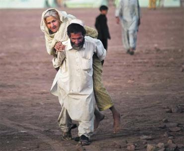 باكستاني نازح من سوات يحمل والدته في أحد المخيمات. أ.ب