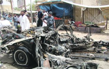 عناصر من الأمن العراقي يعاينون حطام السيارة المفخخة في البطحاء. رويترز