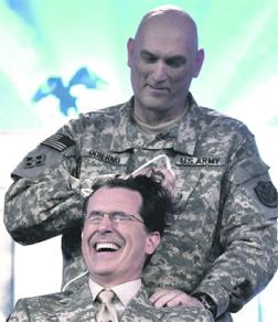 لقطة كوميدية يتم فيها حلاقة شعر كولبرت بأمر من أوباما. أ.ب