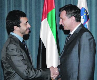 عبدالله بن زايد يصافح رئيس وزراء سلوفينيا بوروت باهور. وام
