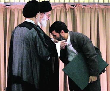 نجاد يحاول تقبيل يد خامنئي عقب مصادقة انتخابه. أ.ف.ب