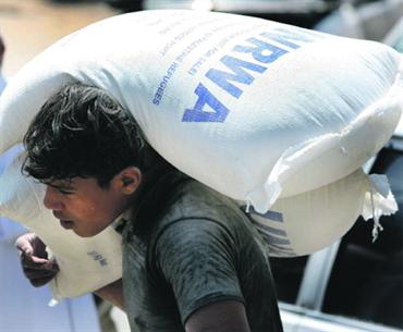 توزيع مساعدات غذائية من «الأونروا» في مخيم الشاطئ. أ.ف.ب