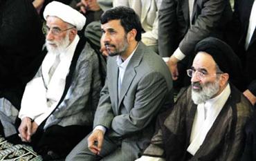 نجاد ومسؤولون إيرانيون أثناء صلاة الجمعة. أ.ف.ب