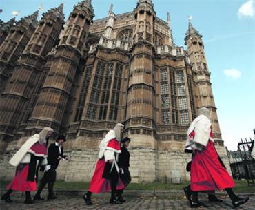 قضاة يغادرون مقر مجلس العموم (البرلمان) البريطاني في وستمنستر، بعد انتهائهم من مراسم أداء الشكر السنوية التي تمثل بداية العام القضائي في الأول من أكتوبر، وترافقها مراسم دينية تقليدية.
