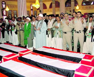 يمنيون يؤدّون صلاة الجنازة على جنود قتلى. إي.بي.إيه