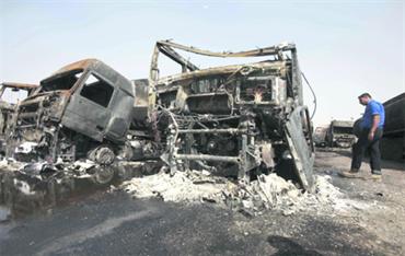 شرطي عراقي أمام حطام ناقلة وقود قرب مطار بغداد. أ.ب