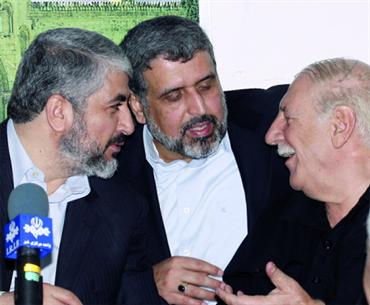 رمضان شلح (وسط) وحديث مع خالد مشعل وأحمد جبريل خلال اجتماع في دمشق أمس. أ.ب