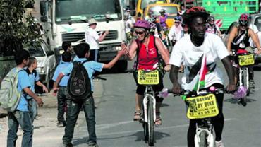 تلاميذ فلسطينيون يرحبون بـ«نساء من أجل السلام» وصلن بدراجاتهن الهوائية إلى الخليل. أ.ف.ب