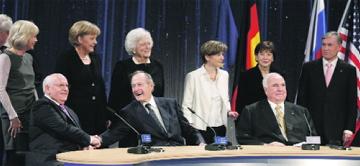 التقى ثلاثة من زعماء حقبة الحرب الباردة، هم المستشار الألماني السابق هلموت كول (79 عاماً) والرئيس الأميركي السابق جورج بوش الأب (85 عاماً) والرئيس السوفييتي السابق ميخائيل غورباتشوف (78 عاماً)، في برلين أمس مع المستشارة أنغيلا ميركل بمناسبة الذكرى الـ20 لسقوط جدار برلين.