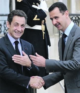 ساركوزي مرحباً بالأسد في قصر الإليزيه. رويترز