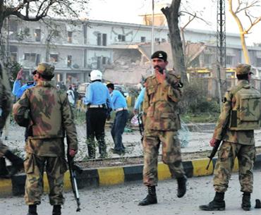 جنود باكستانيون أمام مقر الاستخبارات في بيشاور بعد التفجير الانتحاري. أ.ف.ب